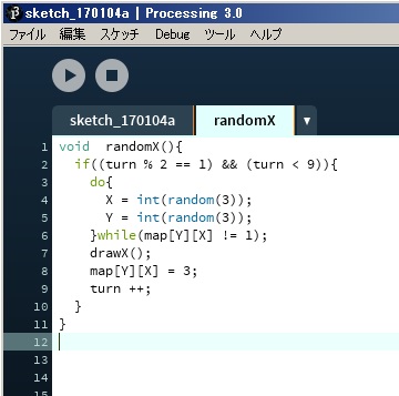 ついでですが、×を書く部分はこの後も何回か登場します。同じことを何回も書くのはわずらわしいですし、読みにくく間違いのもとです。ですので、この個所も関数化してしまいましょう。関数名はdrawX()とします。上記のline関数が使われている2行を、drawX(); と置き換えます。そして、randomX() 関数の定義の後に新しく drawX() 関数の定義を書きます。中身はさきほど削除した2行の line() 関数のみです。