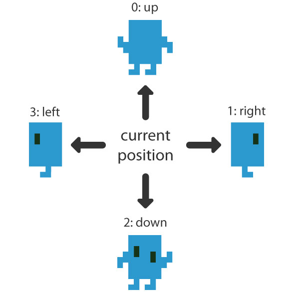 では、「向き」をどのように表せばいいでしょうか。向きを表現するために、新しく dir という変数を用意してみました。現在位置から見て上に移動する場合は dir を0とし、時計回りに右、下、左に移動する場合はそれぞれ1,2,3と値を設定することとします。上では「回転」と書いていますが、図形を回転させたりは特にしていません。dirの初期値を2としているのは、はじめは下向きにしておきたいからです。