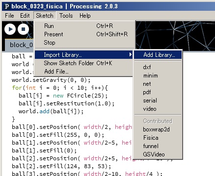 これまで使ってきませんでしたが、今回からFisicaという物理演算のライブラリを使用します。ライブラリとは、自分で定義したり記述したりするとなかなか面倒な色々な処理をひとまとめにしてくれている便利な道具です。Fisicaは、Processing用の物理演算ライブラリです。