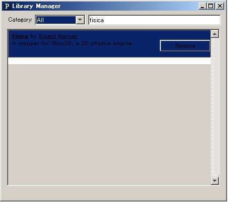 Processingのメニューの “Sketch” → ”Import Library” → “Add Library” で、検索窓に “Fisica” と入力し、”Install” ボタンを押せばインストールされます。下の右図はインストール後の画像です(写真はProcessing 2 です)。