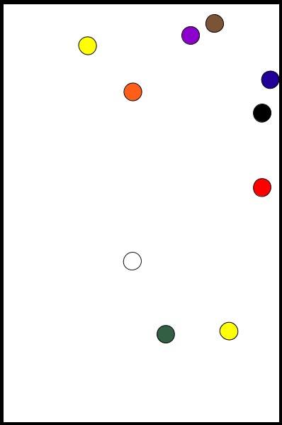 setup() の中で、ball[0]~ball[9] の書き方がちょっとスマートではないのですが、場所や色が不規則なのでこのようにしてみた次第です。もっとしゅっとした書き方があるかも。色々調べます。
