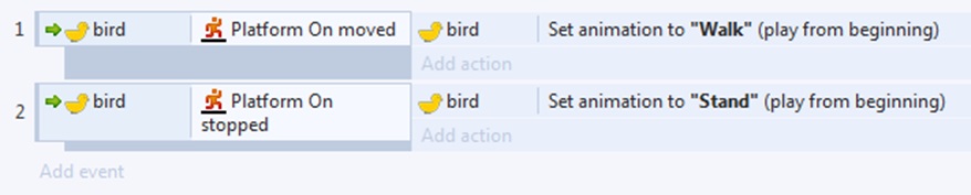 - Event sheet に戻り、Add event,Bird → Next,On Stopped → Done